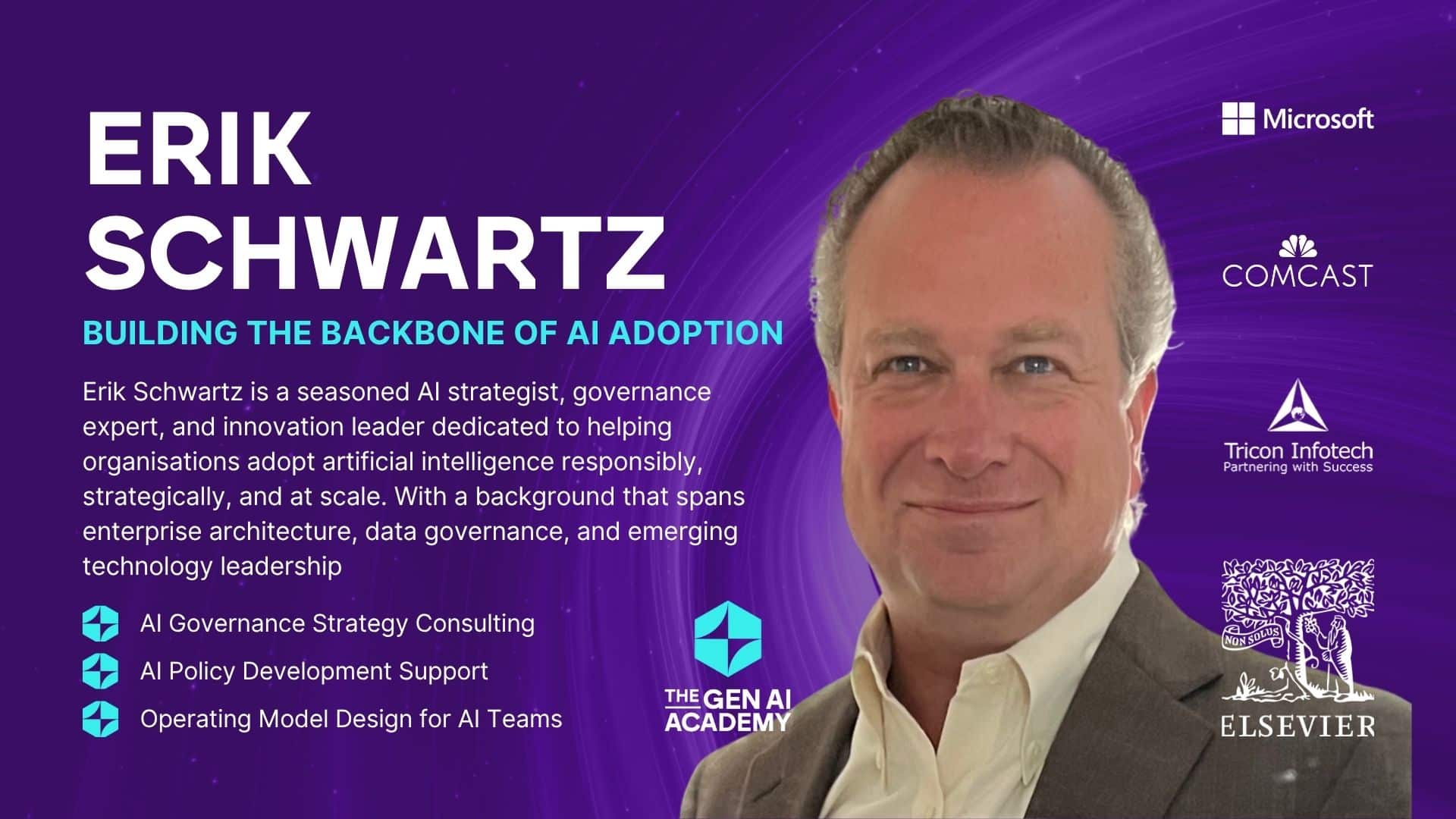 Erik Schwartz est un stratège senior en IA et un expert en transformation numérique qui possède une grande expérience dans la transformation de technologies complexes en solutions évolutives et concrètes. Fort d'une expérience à des postes de direction chez Microsoft, FAST et Elsevier, Erik a aidé des entreprises internationales à mettre en place les structures opérationnelles et techniques nécessaires pour adopter efficacement l'IA et générer une valeur mesurable.