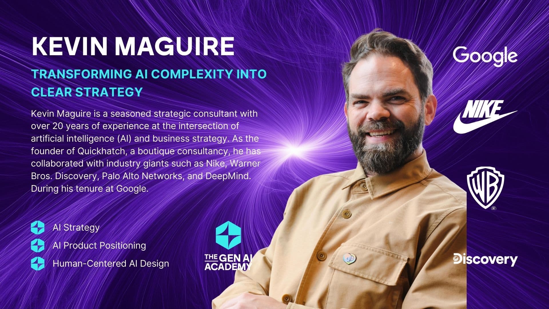 Kevin Maguire est un consultant stratégique chevronné qui compte plus de 20 ans d'expérience à la croisée de l'intelligence artificielle (IA) et de la stratégie commerciale. En tant que fondateur de Quickhatch, un cabinet de conseil spécialisé, il a collaboré avec des géants de l'industrie tels que Nike, Warner Bros. Discovery, Palo Alto Networks et DeepMind. Au cours de son mandat chez Google.