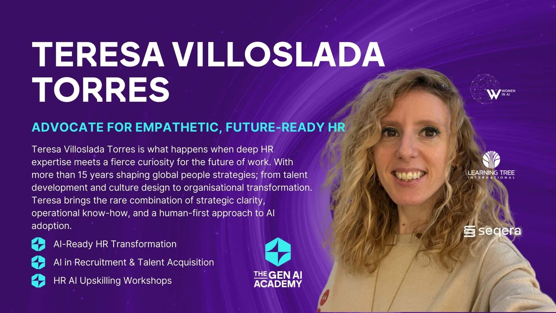 Teresa Villoslada Torres est le résultat de la rencontre entre une expertise approfondie en ressources humaines et une curiosité insatiable pour l'avenir du travail. Forte de plus de 10 ans d'expérience dans le secteur des technologies, Teresa a contribué au développement des talents, à la conception de la culture d'entreprise et à la transformation organisationnelle. Teresa apporte une combinaison rare de clarté stratégique, de savoir-faire opérationnel et d'approche centrée sur l'humain dans l'adoption de l'IA.