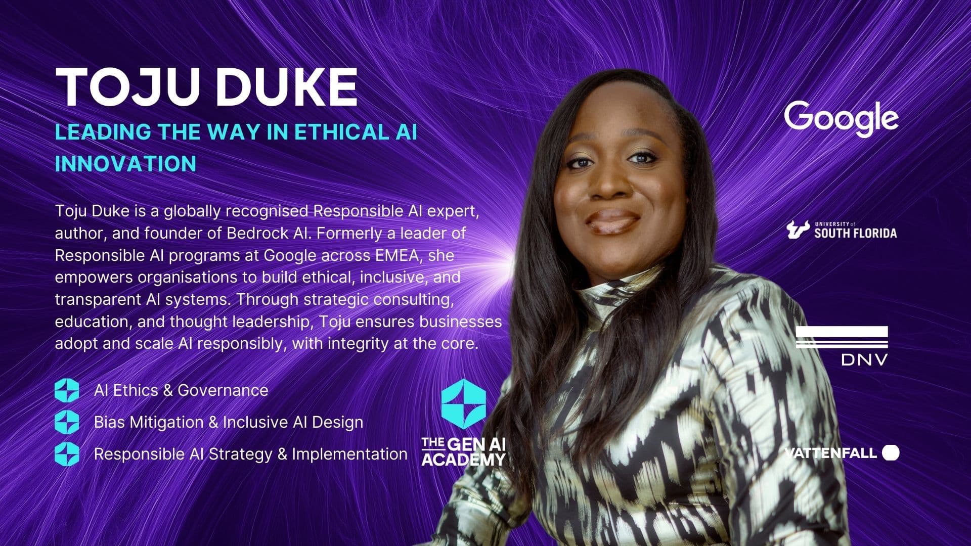 Le discours liminaire de Toju Duke sur la responsabilité dans un monde axé sur l'IA a été l'un des moments forts de l'événement. Elle a parlé avec passion de la quatrième révolution industrielle que nous observons actuellement avec l'essor de l'IA, et de la manière dont nous devons gérer cette évolution pour garantir la responsabilité des entreprises.